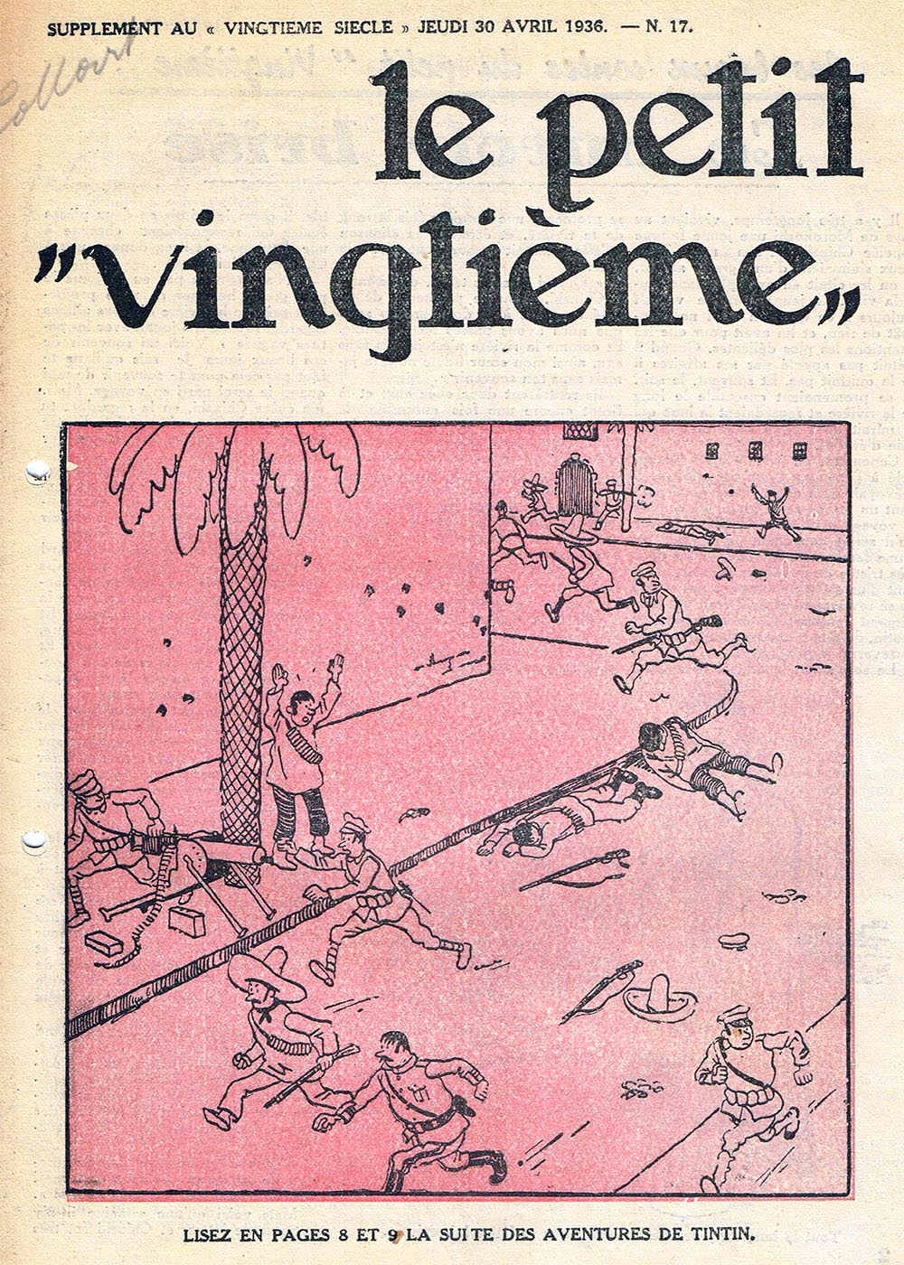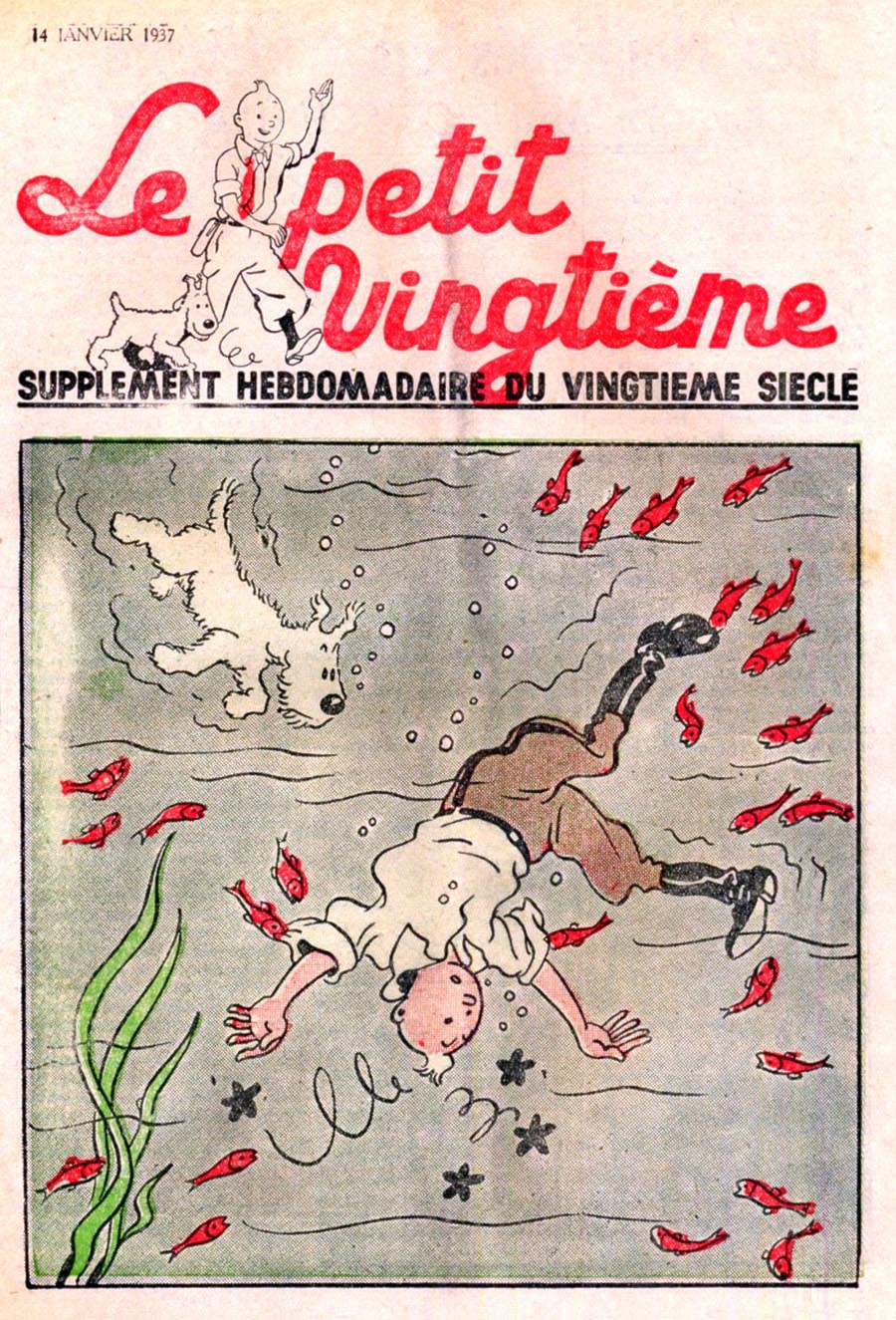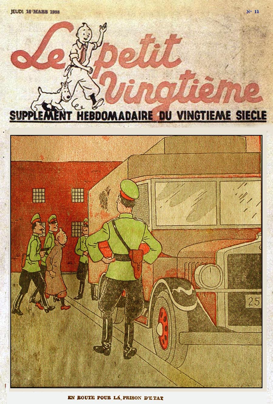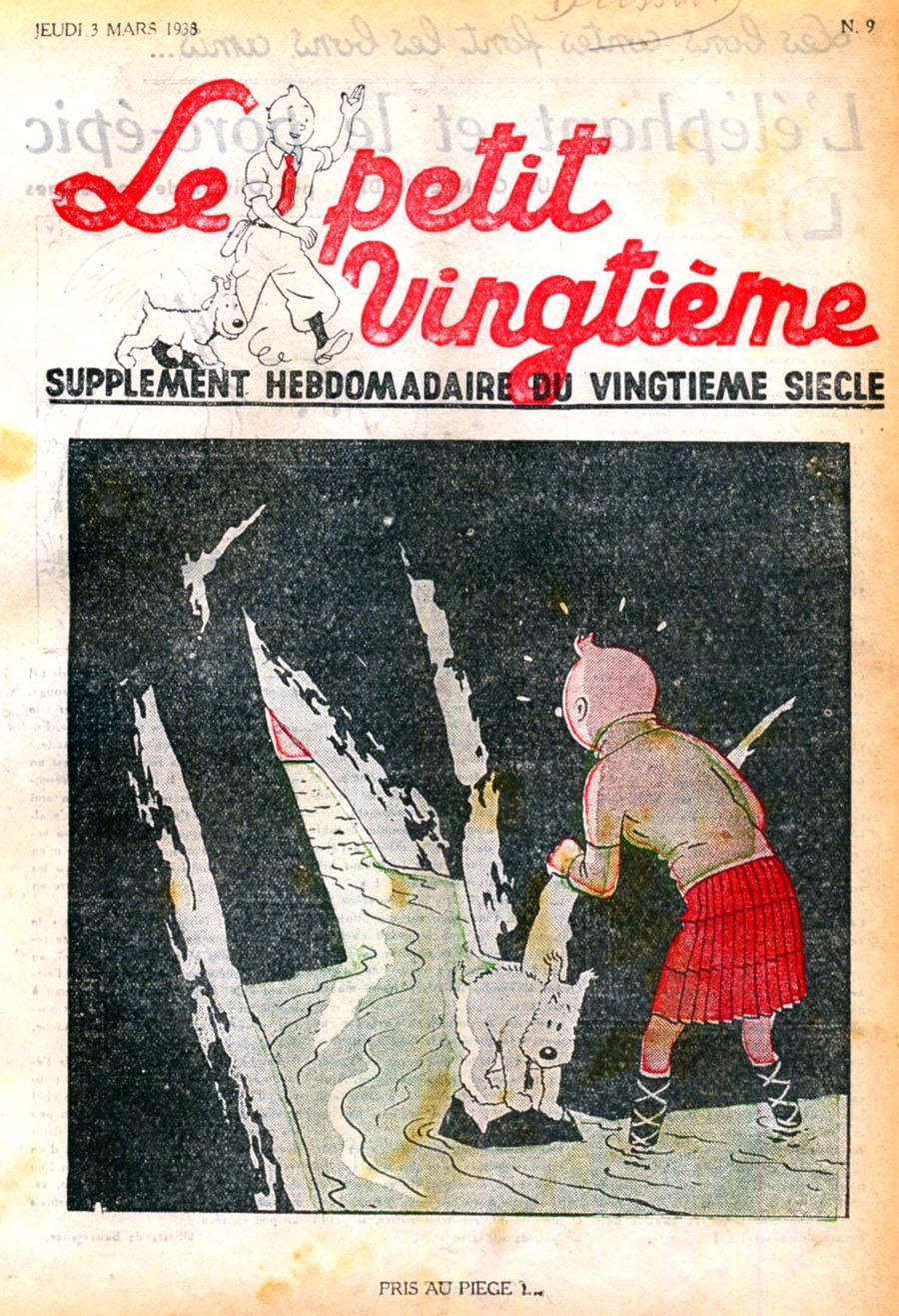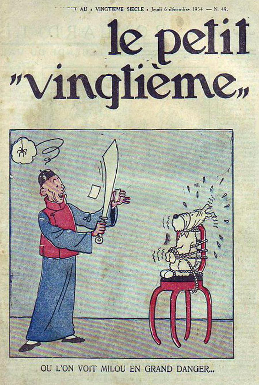 Pratiquement chaque semaine, jusqu’au 9 mai 1940, (date de l’invasion de la Belgique par les troupes allemandes) “Le Petit Vingtième” publiera sur une double page les Aventures de Tintin en pré-publication. La dernière aventure sera interrompue le 9 mai 1940 pour cause d’invasion allemande de la Belgique. La dernière case représentait Tintin, dans le désert, sous la menace du fusil de Müller.
