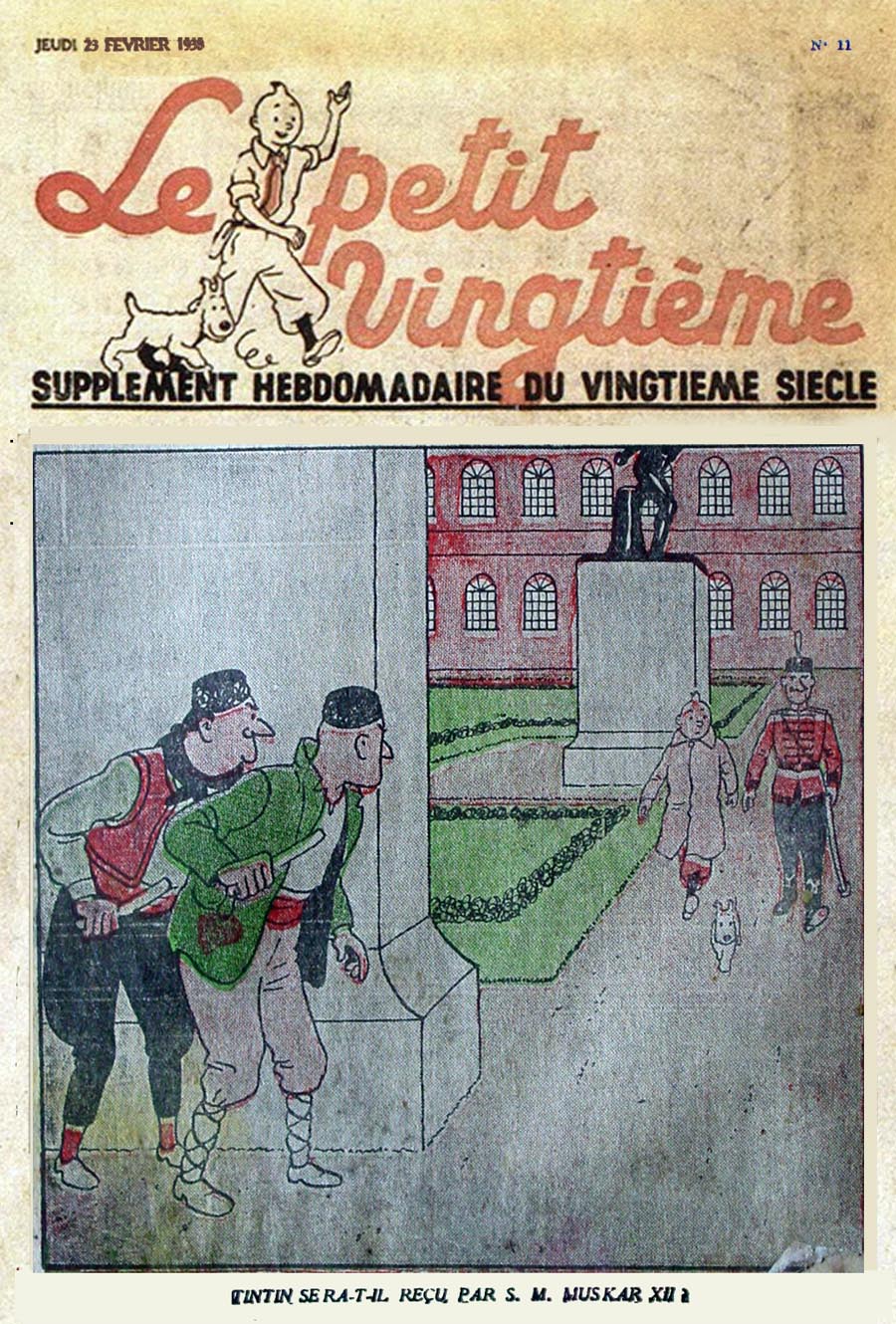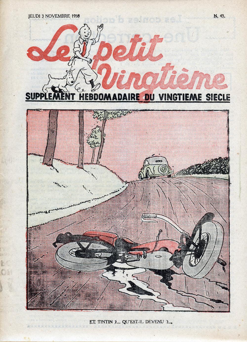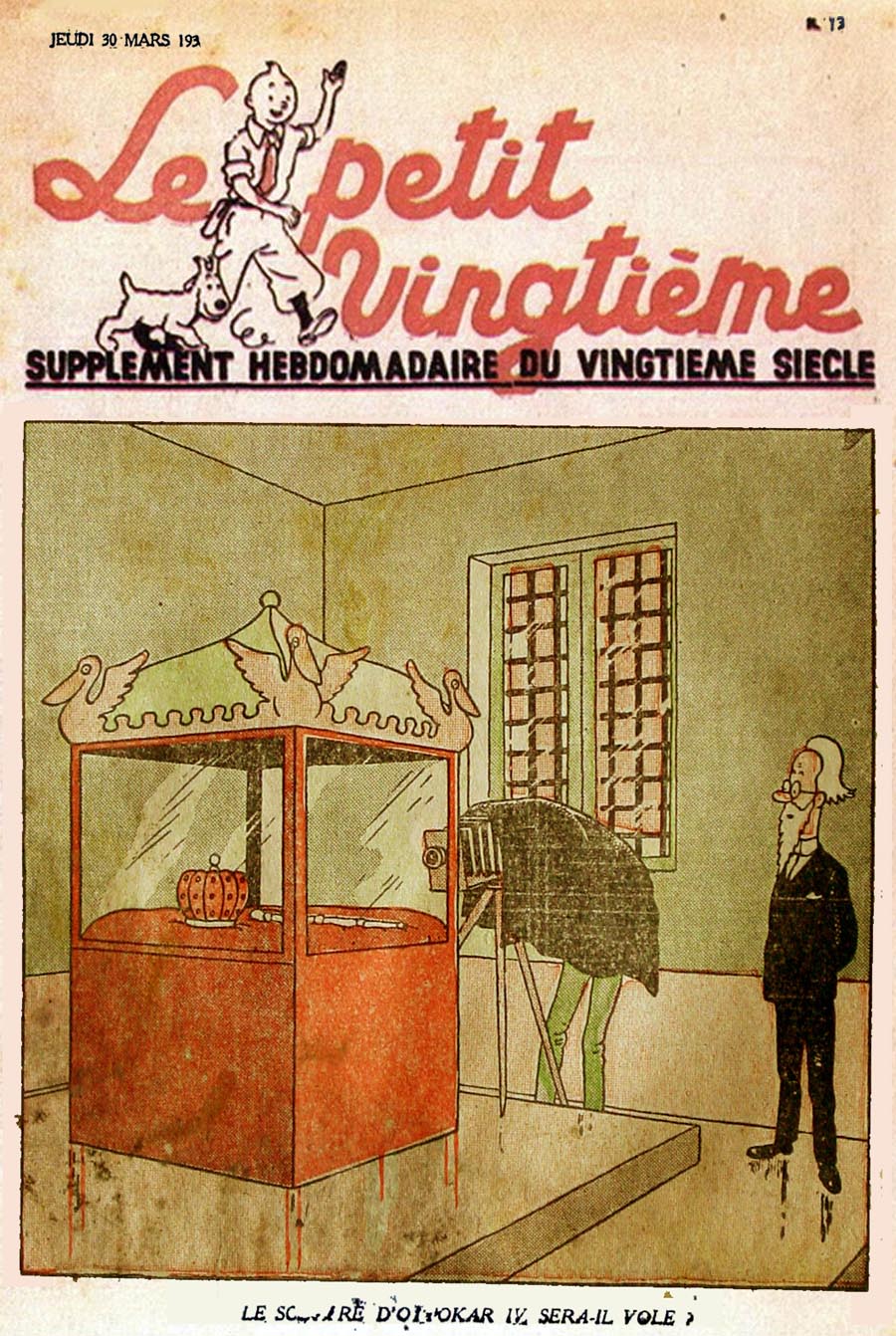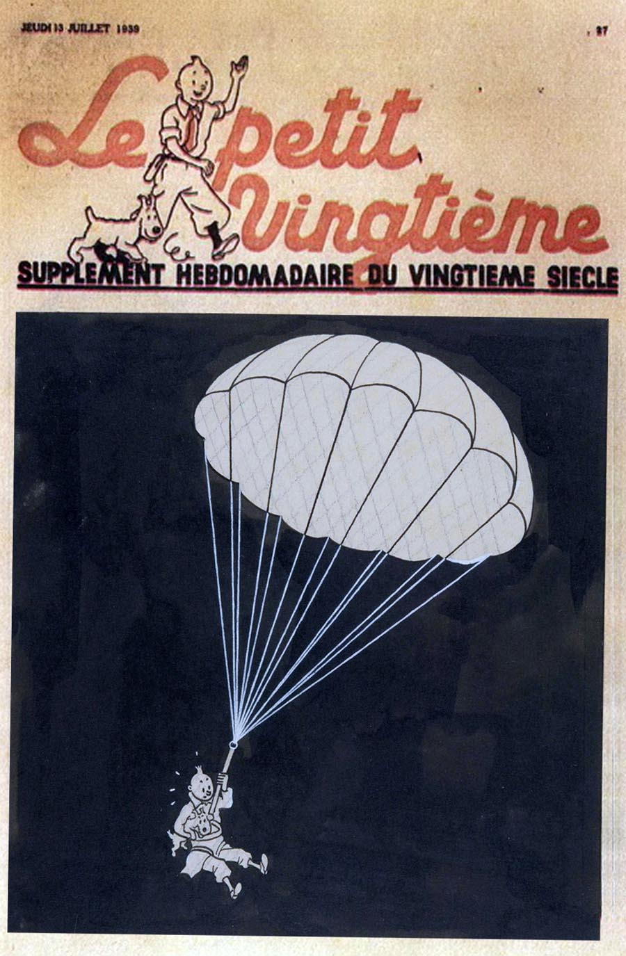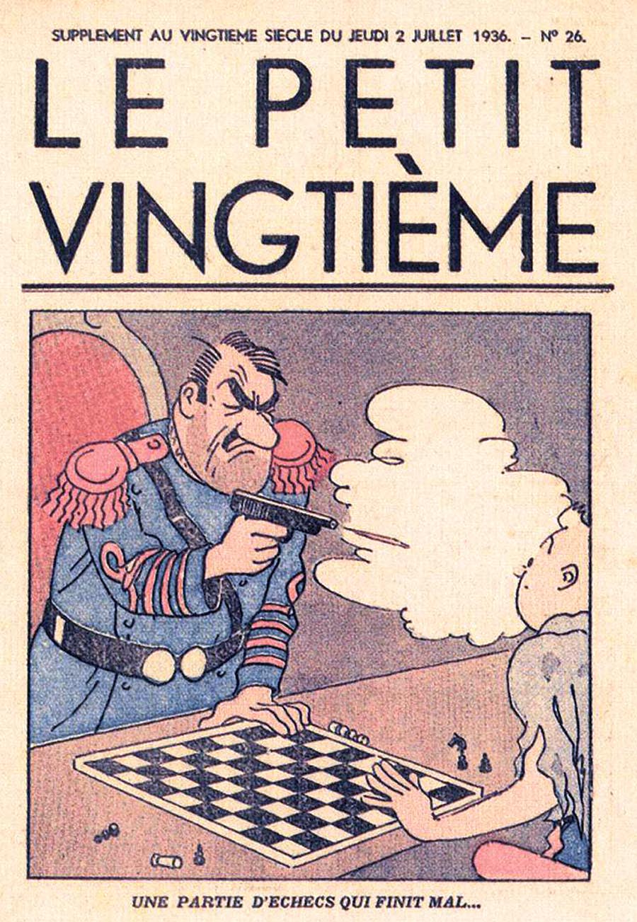 Pratiquement chaque semaine, jusqu’au 9 mai 1940, (date de l’invasion de la Belgique par les troupes allemandes) “Le Petit Vingtième” publiera sur une double page les Aventures de Tintin en pré-publication. La dernière aventure sera interrompue le 9 mai 1940 pour cause d’invasion allemande de la Belgique. La dernière case représentait Tintin, dans le désert, sous la menace du fusil de Müller.
