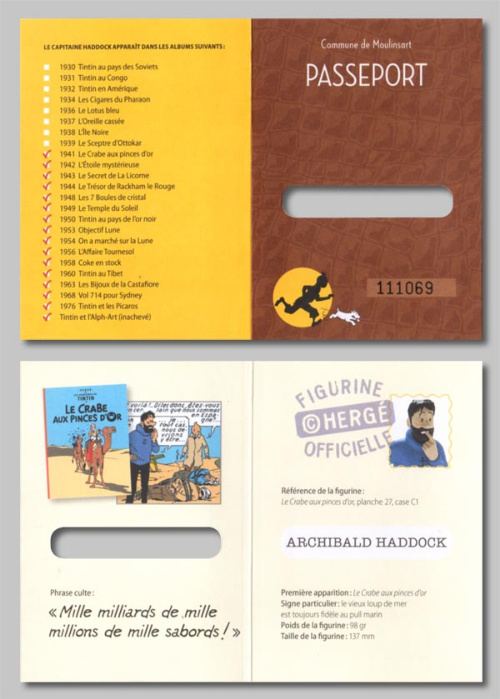 - Version Moulinsart : avec le logo tintin.com sous le socle, sans livret ni passeport