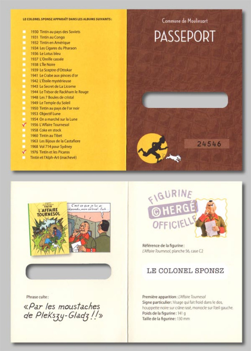 - Version Moulinsart : avec le logo tintin.com sous le socle, sans livret ni passeport