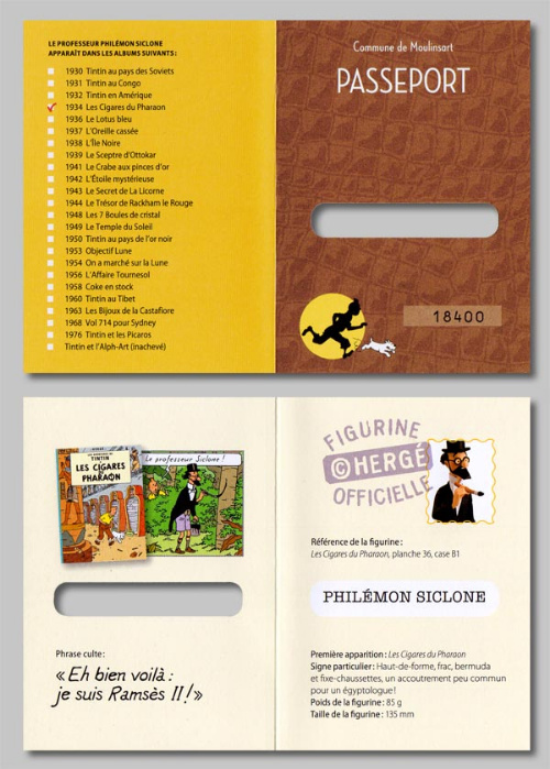 - Version Moulinsart : avec le logo tintin.com sous le socle, sans livret ni passeport