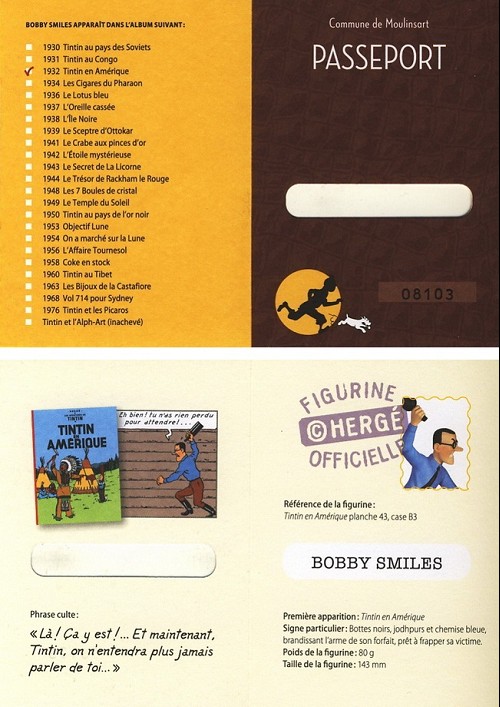- Version Moulinsart : avec le logo tintin.com sous le socle, sans livret ni passeport