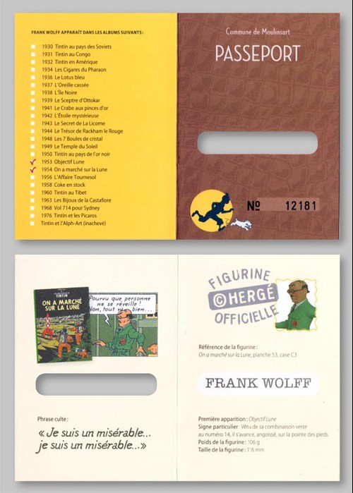 - Version Moulinsart : avec le logo tintin.com sous le socle, sans livret ni passeport