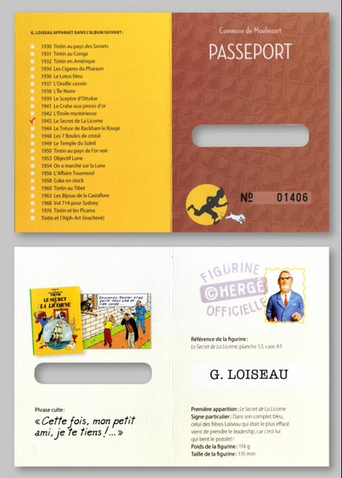 - Version Moulinsart : avec le logo tintin.com sous le socle, sans livret ni passeport