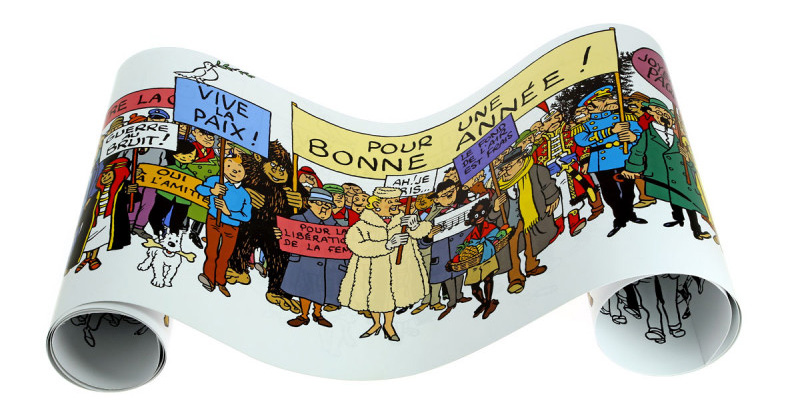 C’est fin 1972, qu’Hergé réalise ce projet de carte de vœux en forme de frise pour l’année à venir. Penché sur sa table à dessin, il s’enferme dans une bulle où seul lui et son savoir-faire sont admis ! Après de nombreuses heures de travail acharné, le dessinateur est souriant, il est arrivé à ses fins… Il réunit ensuite ses collaborateurs pour modifier quelques éléments, avant de se remettre à l’ouvrage pour la mise à l’encre finale. Le résultat : une magnifique frise qui présente les personnages mythiques des Aventures de Tintin.