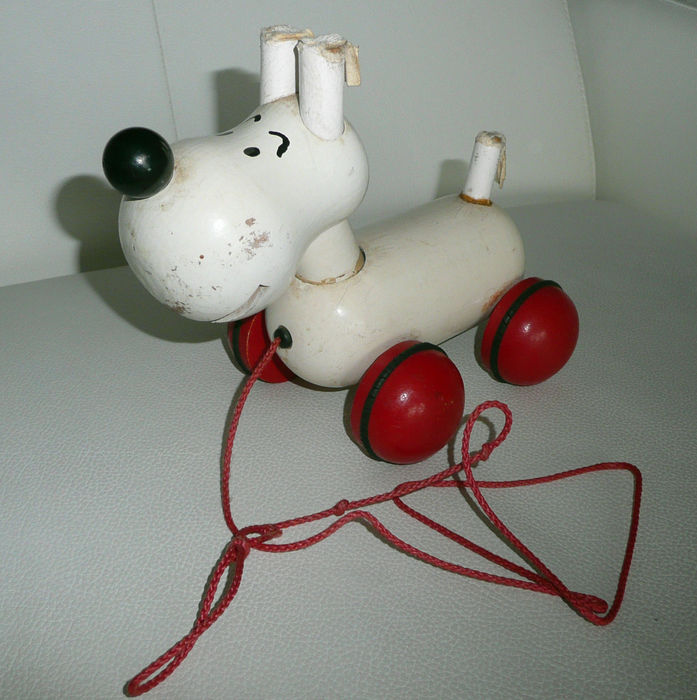 Jouet à tracter de Milou en bois. Les oreilles et la queue sont recouverts par un simili blanc