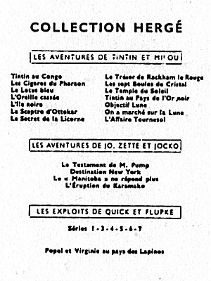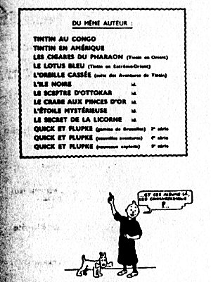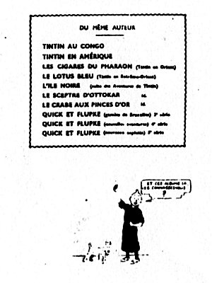 À noter : les pages de gardes imprimées représentant Tintin dans différentes attitudes, au trait blanc sur fond bleu foncé, apparaîtront dans le retirage de 1938, et la mention "Hergé" sur la couverture seulement en 1941.