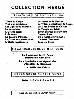 Les albums sont répartis en 5 grandes séries, en fonction de leur 4e plat (le dos de l'album). La série neutre avec le dos blanc (tirages de tête), la série P avec un carré de texte noir (1931-1934), la série A avec un carré à bord rouge et Tintin et Milou en bas (1937-1945), la série B avec un montage des symboles des albums (1945-1975), et la série C avec les couvertures des albums sur fond brun (dès 1975). La série D avec les couvertures des albums sur fond blanc n'est pas reprise ici.