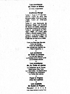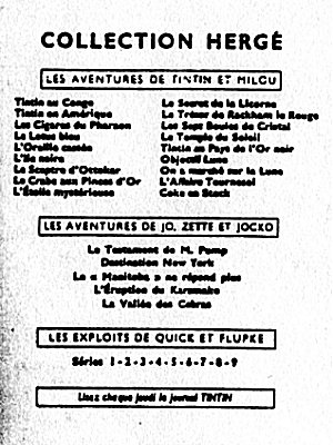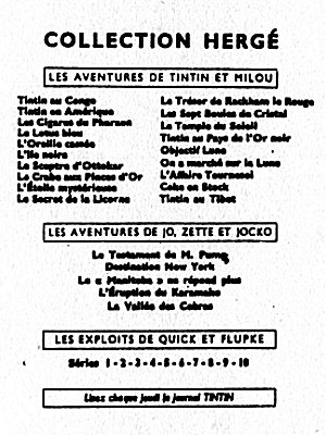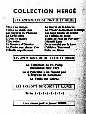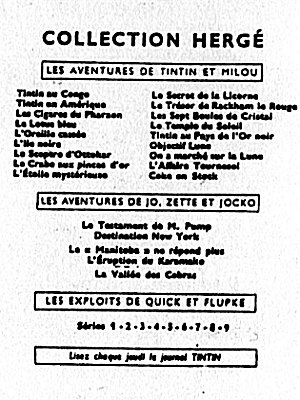 Les albums sont répartis en 5 grandes séries, en fonction de leur 4e plat (le dos de l'album). La série neutre avec le dos blanc (tirages de tête), la série P avec un carré de texte noir (1931-1934), la série A avec un carré à bord rouge et Tintin et Milou en bas (1937-1945), la série B avec un montage des symboles des albums (1945-1975), et la série C avec les couvertures des albums sur fond brun (dès 1975). La série D avec les couvertures des albums sur fond blanc n'est pas reprise ici.