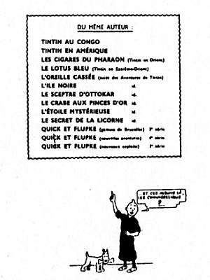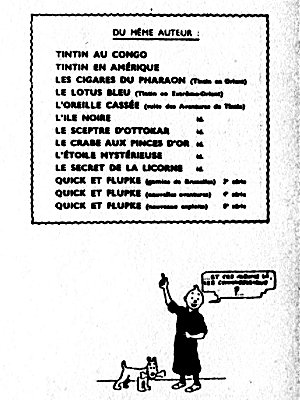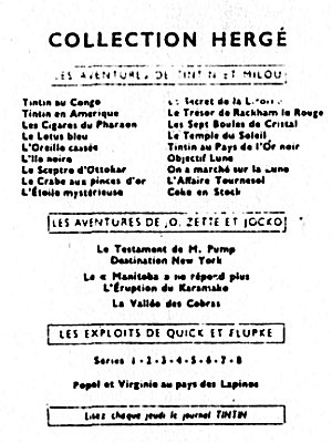 Publication initiale dans "Le Soir" du 20 octobre 1941 au 21 mai 1942 à raison d’un strip quotidien, soit 176 strips noir et blanc parus sous le titre "Les aventures de Tintin et Milou".