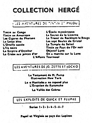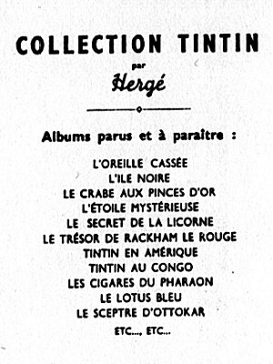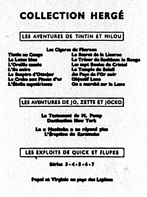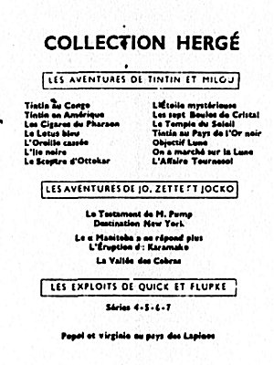 Les albums sont répartis en 5 grandes séries, en fonction de leur 4e plat (le dos de l'album). La série neutre avec le dos blanc (tirages de tête), la série P avec un carré de texte noir (1931-1934), la série A avec un carré à bord rouge et Tintin et Milou en bas (1937-1945), la série B avec un montage des symboles des albums (1945-1975), et la série C avec les couvertures des albums sur fond brun (dès 1975). La série D avec les couvertures des albums sur fond blanc n'est pas reprise ici.